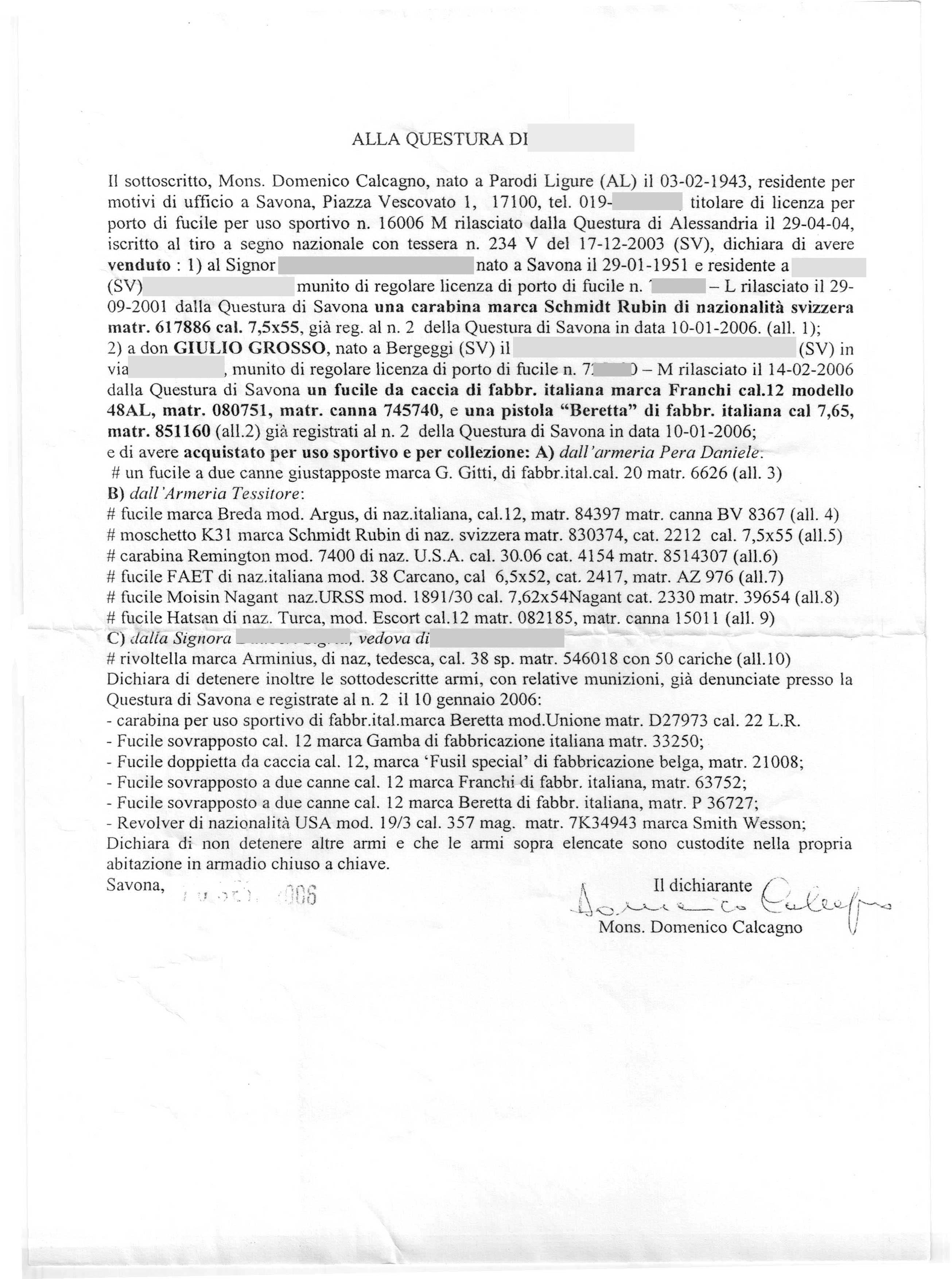 Vende uno dei vecchi fucili, ma anche un fucile Franchi cal 12 e una pistola semiautomatica Beretta calibro 7,65 (un sempreverde). L’acquirente? Un altro ecclesiastico: Don Giulio Grosso nativo di Bergeggi.
