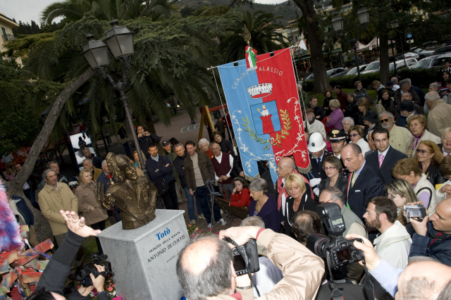 Sabato 4 aprile 2009, tutto è incominciato alle ore 17:00, quando la banda cittadina in parata nel budello alassino suonava le musiche di Totò e un colorato cerimoniere (il mago di Az) annunciava in stile "pazzariello" udite udite: oggi 4 aprile 2009, ore 18:00 siete tutti invitati nei giardini di Piazza Stalla per la presentazione del busto in omaggio al principe della risata in arte Totò. Ore 18:00 all'arrivo della banda ai giardini di Piazza Stalla, il conduttore-attore Mario Mesiano dava il via alla festa con una particolare versione narrata della storica canzone "malafemmina". A seguire: fax con saluti pervenuti dal nostro Presidente della Repubblica Giorgio Napolitano, saluti da parte del primo cittadino Marco Melgrati e dell'Assessore al turismo e cultura Monica Zioni, presentazione della madrina Liliana De Curtis (figlia di Antonio De Curtis) per i saluti ufficiali, esibizione della banda musicale con "la mazurka di Totò" e ancora Mario Mesiano che interpreta la "preghiera del clown" come sottofondo nel momento della titolazione dei giardini dedicati al principe della risata Antonio De Curtis Totò. La manifestazione continua regalando grandi emozioni come: la firma della celebre piastrella da parte di Liliana De Curtis direttamente al pittore Mario Berrino, ideatore dello storico Muretto di Alassio, la consegna del quadro Alassio & Totò (olio su tela) realizzato dal pittore alassino Rudy Mascheretti in omaggio a Liliana De Curtis, l'originale e toccante interpretazione della mitica poesia "la livella" a cura dell'attore Renzo Sinacori ed infine "rullo di tamburi" da parte della banda cittadina per la presentazione con tanto di taglio del nastro tricolore del prestigioso busto in bronzo realizzato dal titolato artista ingauno Flavio Furlani. Un opera tanto bella e tanto "viva" da far commuovere Liliana De Curtis ! Liliana De Curtis dichiara subito al pubblico la sua felicità ringraziandolo per il grande calore dimostrato nei riguardi di papà. Una testimonianza d'affetto al talento di un grande artista, ma soprattutto all'uomo Totò, che da 50 anni ha saputo e continua farci ridere e piangere. Toccante la testimonianza della figlia Liliana De Curtis, quando racconta delle storiche vacanze di papà ad Alassio passate tra mare e teatro. Ma ancor di più quando lei stessa "rimprovera" la sua Napoli politica di essersi dimenticata di quell'affetto che il popolo napoletano tutt'ora le riconosce. La manifestazione si conclude con la benedizione dei giardini e dell'opera da parte di Don Angelo e Padre Valter, ma soprattutto con l'applauso di un pubblico delle grandi occasioni. Ricordiamo gli appuntamenti collaterali svoltasi presso la ex Chiesa Anglicana, venerdì 3 aprile:ore 18.00 proiezione dei film "Miseria e nobiltà" e ore 21.00 "Signori si nasce" sabato 4 aprile: ore 21.00 proiezione del film "La banda degli onesti" - domenica 5 aprile: ore 17.00 presentazione del libro "MALAFEMMINA" a cura di Liliana De Curtis con la conduzione di Elisabetta Mandraccio. ore 21:00 proiezione del film "Tototruffa '62".