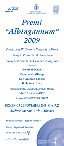 Domenica 22 novembre, presso l'Auditorium San Carlo, alle ore 17, si terrà la premiazione del IV Concorso Nazionale di Poesia "Albingaunum" indetto dal Dopolavoro Ferroviario di Albenga in collaborazione con il Comune di Albenga, i Fieui de Caruggi e la Palazzo Oddo srl.