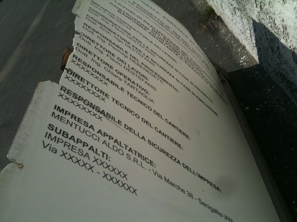 Non ce ne vogliano, ma "per cosa" esattamente non siamo riusciti a capirlo lì per lì, e speriamo ce lo spieghino. Su questa bell'insegna consunta ormai dal tempo, non sfugge ai piu attenti un raffinato particolare: mentre i primi nomi dei funzionari vengono riportati correttamente (tra i quali il "nostro" Debenedetti), il direttore Responsabile tecnico del cantiere si chiama XXXXXXXX (testuale) così come il direttore e il Responsabile sicureza dell'Impresa: XXXXXXXXX (sic. guardare per credere)