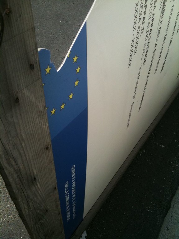 Questo cartello di appalto, pezzo unico nel suo genere, giace oggi accartocciato al suolo, offrendo pudicamente le spalle ai visitatori curiosi, tra gli uffici della Capitaneria di Porto e quelli di Mondo Marine. Noi, più curiosi, lo avevamo fotografato un paio di mesi fa, e lo abbiamo ri-fotografato ieri, in tutto il suo fulgore.