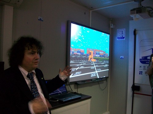 Durante la visita al Campus tra i vari simulatori il Virtual Port Mobile Center, un laboratorio mobile creato dal Simulation Team per la Ricerca e la Formazione in ambito Marittimo che sarà consegnato al CentralLabs di Cagliari. In questa sorta di container mobile, una casa vivibile dotata di aria condizionata sono presenti le più moderne tecnologie di simulazione ovvero una CAVE (Caverna virtuale immersiva all'interno della quale viene riprodotto un porto virtuale), una piattaforma mobile a 6 gradi di libertà, suoni e vibrazioni 3D, postazione di guida di mezzi pesanti (gru di banchina, gru di piazzale, ralle). Simulatori di diversi mezzi comandati da operatori umani e dal computer interagiscono riproducendo le operazioni portuali ed evidenziando gli aspetti legati a varie criticità, produttività, tempi, costi e sicurezza.