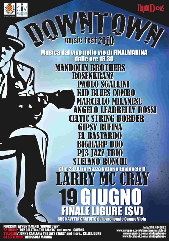 Il Downtown Music Fest farà vivere a Finale l'atmosfera delle kermesse musicali che si svolgono in molte grandi città del mondo e che vedono gli artisti suonare nelle vie e nelle piazze rigorosamente dal vivo. dicono gli organizzatori - I concerti prenderanno il via alle 18,30 e si susseguiranno senza interruzioni fino all'evento clou della serata: la performance di Larry Mc Cray". Finalmarina accoglierà il pubblico con un fitto programma di concerti e con occasioni per lo shopping nei negozi, che saranno aperti fino a tarda ora.