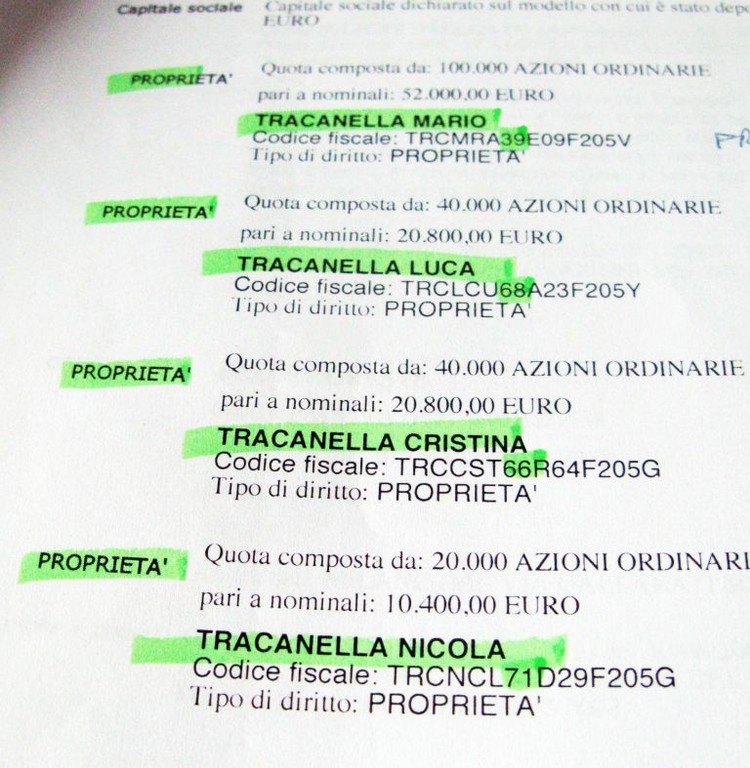E di chi è la SOREPROFA Spa? Di Mario Tracanella, Luca Tracanella, Cristina Tracanella e Nicola Tracanella.