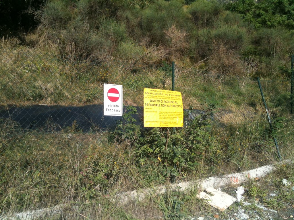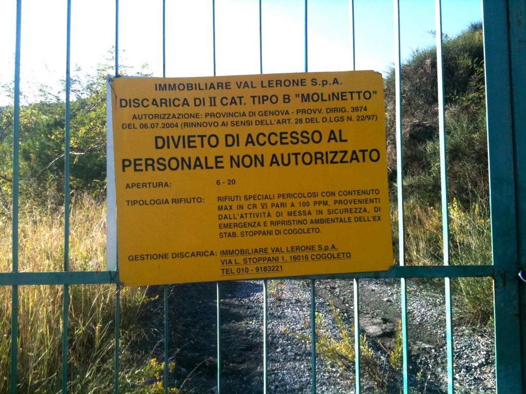 Il cartello all'ingresso indica la proprietà della "Immobiliare Val Lerone Spa" fallita con provvedimento dell'Autorità Giudiziaria il 14/06/2007 (sede legale a Milano) che ben si sarebbe guardata dall'effettuare le bonifiche previste. L'impianto è abbandonato da tre anni, ma il cartello è ancora lì. Leggiamo: "rifiuti speciali pericolosi con contenuto max in CR VI (cromo esavalente n.d.r.) pari a 100 ppm". Una cancerogena enormità.