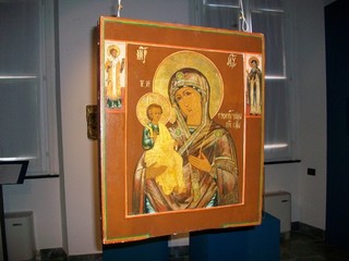Il prof. ha deciso di curare la mostra sulle icone orientali perchè mi ha spiegato di essere stato incuriosito dalla presenza in queste rappresentazioni di icone con tre mani legate ad una storia con protagonista Giovanni di Damasco, poeta e filosofo dell’ottavo secolo che punito da Leone III per aver rappresentato un’immagine sacra fu costretto all’amputazione di una mano ma grazie alla sue preghiere all’icona, la sua mano magicamente ricomparve e per ringraziare la madonna di questo miracolo disegnò una terza mano come ex-voto al collo della vergine e come lui molti seguirono questo esempio. Pian piano la mano da oggetto estraneo al corpo divenne successivamente in altre icone parte integrante del corpo. La mostra è stata prorogata perchè perchè ci sembrava attinente la presenza di queste immagini sacre anche durante il periodo natalizio, perciò la mostra che doveva terminare il 21 novembre si potrà visitare fino al 10 gennaio. Altro appuntamento interessante quello del 18 novembre nella nostra sala in Pinacoteca si terrà una conferenza alle 17 dove il prof. Mantero presenterà le ricerche su questo tipo di icona".