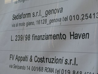 Nell'attesa proviamo a sentire l'impresa esecutrice FV Appalti Srl di Vittorio Ferro e Tamara Monteleone, sede a Roma ma secondo il cartello di appalto, utenza telefonica a Savona. Comodo. Il numero risulta però Scollegato. Tentiamo con un altro numero, quello della sede di Piazza Chabrol: nessuno risponde.