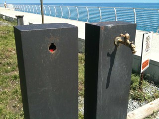 Ovviamente i pregiatissimi rubinetti in ottone sono durati poco, vittima dei soliti vandali o di qualche ricambista spregiudicato: li hanno divelti entrambi ma ne hanno riparato uno solo, che ù custa, ma non con l'originale bensì con uno da ferramenta roccocò, per mantenere alto il livello del design.Vedi sotto il trionfo della torta di riso.