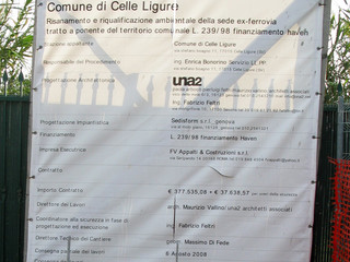 Proviamo dunque con l'Ing. Maurizio Feltri di Savona, co-progettista, che cortesemente ci risponde, ma precisa di occupa solo della sicurezza, e ci rimanda allo studio di progettazione UNA2 di Genova dal quale siamo tuttora in attesa di una richiamata (come dal comune di Celle, del resto)