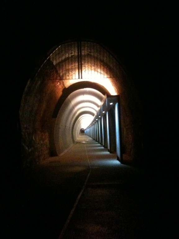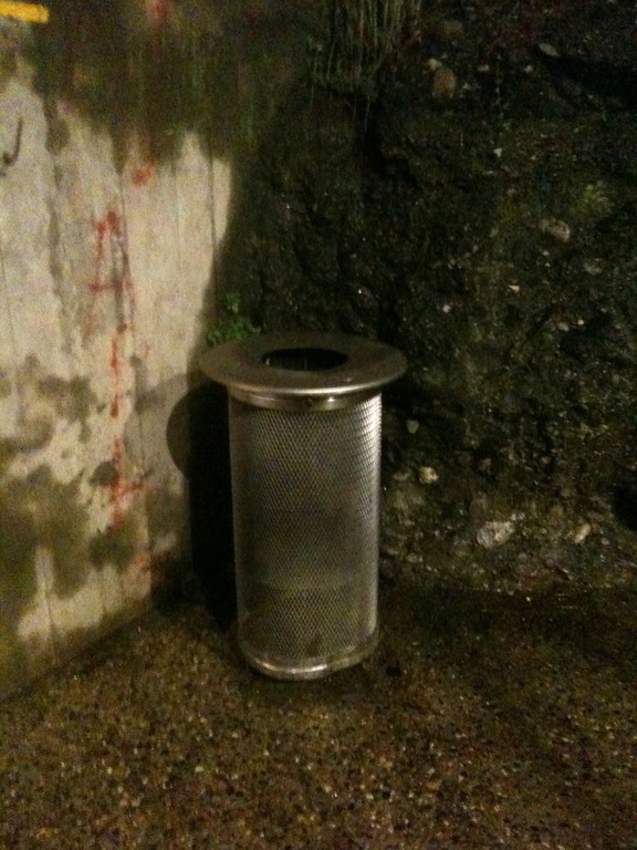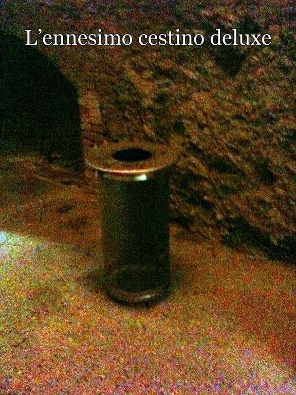 Già che siamo a Celle a controllare "l'oscurità che avvolge i "lampioni d'oro" in zona passeggiata, approfittiamo per percorrerne il tratto ricavato nella galleria ex FS riadattata senza risparmi e foderata in "guard rail" a tutta campata. Fuori non sta piovendo, dentro, un po' si. Qua e la, cestini della rumenta da € 1000 cadauno, sempre della Santa e Cole, in acciaio diciamo "inox".