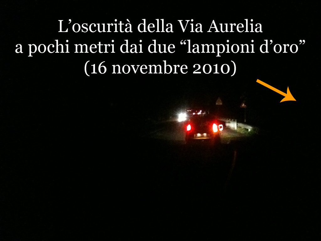 Ma se sull'Aurelia l'illuminazione pubblica è assente ci vien detto che è cosa della Provincia. E si riparte daccapo.