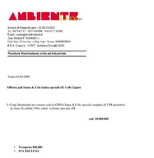 Un'ora dopo, alle 16:50 di ieri, finalmente, salta fuori IL documento. Dunque… salvo errori ed omissioni la spagnola Santa & Cole ha sede a Barcellona, una filiale a Milano MA: i due "lampioni d'oro" sarebbero stati venduti da un'azienda di Cuneo all'impresa costruttrice di Finale Ligure che ha realizzato le opere.