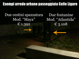 I lavori della tratta di passeggiata nei pressi di Albisola sono in ritardo di oltre un anno, e tuttora in corso. Quelli della tratta a levante di Celle sono "completati" ed includono un oggettistica a dir poco onerosa come cestini, fontanelle, lampioni e maxilampioni. In particolare DUE di questi sono quotati dal listino del fabbricante ad € 13.480 cadauno + IVA. Il problema - tra gli altri - è che questi megalampioni sono… normalmente spenti.