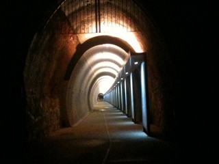 Già che siamo a Celle a controllare "l'oscurità che avvolge i "lampioni d'oro" in zona passeggiata, approfittiamo per percorrerne il tratto ricavato nella galleria ex FS riadattata senza risparmi e foderata in "guard rail" a tutta campata. Fuori non sta piovendo, dentro, un po' si. Qua e la, cestini della rumenta da € 1000 cadauno, sempre della Santa e Cole, in acciaio diciamo "inox".