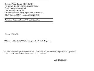 Un'ora dopo, alle 16:50 di ieri, finalmente, salta fuori IL documento. Dunque… salvo errori ed omissioni la spagnola Santa & Cole ha sede a Barcellona, una filiale a Milano MA: i due "lampioni d'oro" sarebbero stati venduti da un'azienda di Cuneo all'impresa costruttrice di Finale Ligure che ha realizzato le opere.