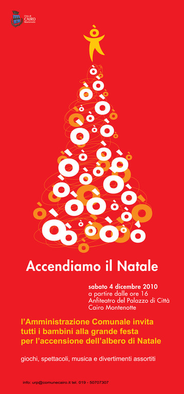 Torna sabato prossimo nell'anfiteatro di Palazzo di Città di Cairo Montenotte il grande appuntamento "Accendiamo il Natale" fortemente voluto dall'amministrazione comunale retta dal sindaco Fulvio Briano e dedicata ai bambini. Prevista l'accensione dell'albero di Natale, quindi giochi, spettacoli, musica e divertimenti. La festa inizierà alle 16 e andrà avanti fino a sera.