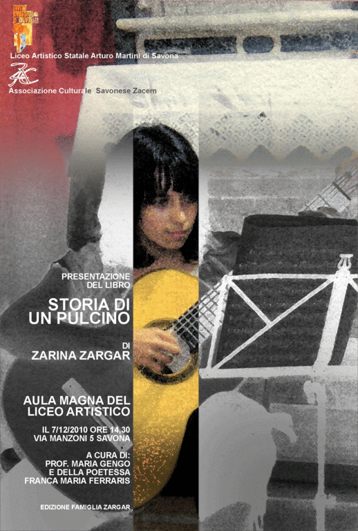 Martedì 7 dicembre alle 14,30 presso l’Aula Magna del Liceo Artistico Arturo Martini, via Manzoni 5, Savona, si terrà la presentazione del libro Storia di un pulcino di Zarina Zargar, alunna del V anno del Liceo. L’Aula Magna del Liceo Artistico è diventata sede, negli anni, di prestigiose presentazioni di libri a cura di alunni alla presenza di autori arrivati anche da molto lontano (Egitto, Palestina), soprattutto per l’iniziativa “I giovani incontrano il mondo” su rilevanti tematiche internazionali. Questa volta, però, il volumetto è quello di una studentessa di diciotto anni. Infatti, come aveva già fatto due anni prima per la sorella Samina con il testo “I miei primi diciotto anni”, la famiglia ha scelto di regalarle, per l’ingresso nella maggiore età, la raccolta dei suoi scritti da quando era una bambina delle elementari fino al diciottesimo compleanno. Negli ultimi anni specialmente, con questi scritti, Zarina ha vinto importanti Concorsi, tra cui, ad esempio, quello regionale sulla Shoah, come dimostra la foto di copertina in cui viene premiata dal senatore Raimondo Ricci a Genova, alla presenza del presidente Burlando, di Giacomo Ronzitti e Amos Luzzatto.