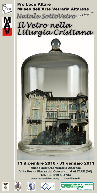 Prosegue fino al 31 gennaio la mostra "Il Vetro nella Liturgia Cristiana", edizione 2010-2011 della rassegna "Natale Sottovetro", organizzata dalla Pro Loco di Altare in collaborazione con il Museo del Vetro e dell'Arte Vetraria Altarese.Nell'affascinante cornice di Villa Rosa in Altare sono esposti pregiati manufatti in vetro soffiato che i maestri altaresi hanno nel tempo realizzato per le funzioni liturgiche. I pezzi unici qui presentati sono di indubbio interesse e valore: acquasantiere del Settecento, calici, ampolline, pissidi, lumi di varia foggia e molto altro ancora. La ricerca di manufatti in vetro creati dai maestri vetrai altaresi del passato appositamente per le funzioni religiose ha portato al coinvolgimento di numerose parrocchie e diocesi italiane. La mostra rimarrà aperta fino al 31 gennaio 2011 con i seguenti orari: dal martedì al venerdì dalle ore 16,00 alle 19,00 il sabato dalle ore 15,00 alle 19,00 la domenica dalle ore 16,00 alle 19,00 Chiuso il lunedì.