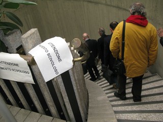 Si scende. Due fogli A4 semiaccartocciati sul corrimano delle scale avvisano: "Attenzione: pavimento scivoloso". Cittadini e Legali tengono i piedi per terra.