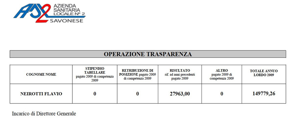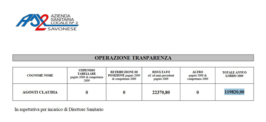 Firmatari del licenziamento sarebbero il direttore sanitario Asl2 Claudia Agosti (compenso annuo 2009 € 119.820,00