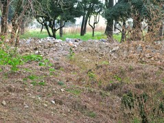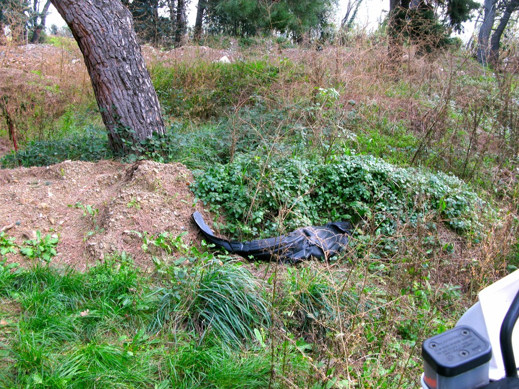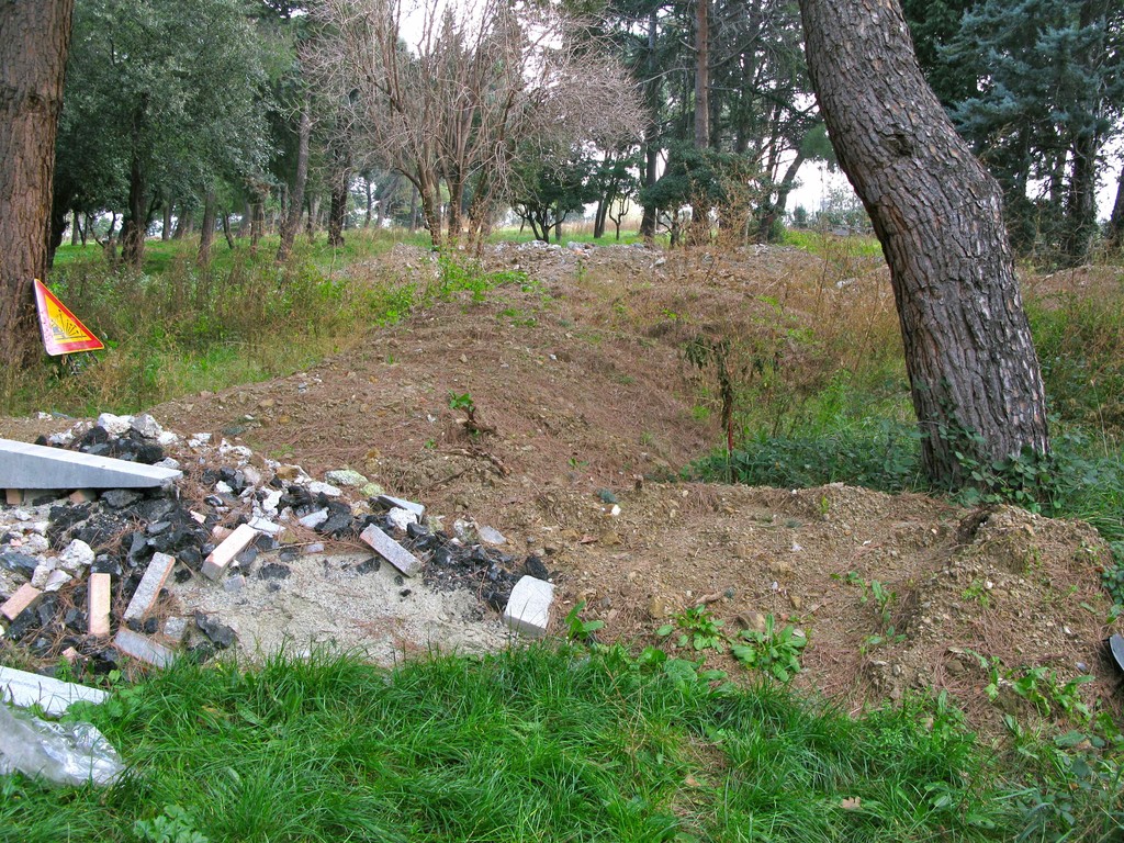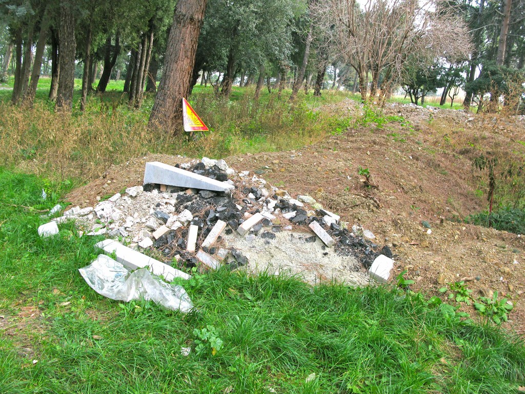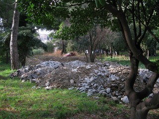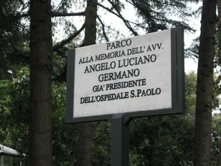 Pochi metri dopo ci imbattiamo in una sorta di discarica, in quello che una volta voleva essere un giardino. Anzi lo era. Di più: un "Parco alla memoria dell' Avv. Luciano Germano, già presidente dell'Ospedale S. Paolo" dice la targa marmorea. Chissà cosa ne penserebbe lui. Cumuli di materiali inerti e da scavo giacciono lì da un tot, visto che ci stanno crescendo le piante sopra. Plastica, pezzi di catrame e chissà cos'altro smaltiti... in ospedale. Prego le foto odierne: