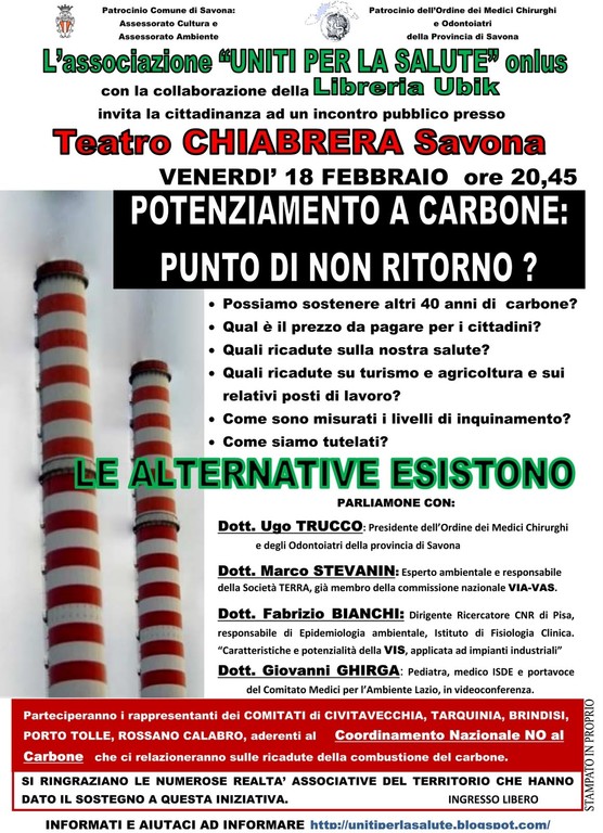 “Uniti per la Salute” Onlus, con la collaborazione di libreria UBIK e il patrocinio dell’Ordine dei Medici e del Comune di Savona (Assessorati Cultura e Ambiente) promuove domani al Teatro Chiabrera (inizio 20,45) un incontro pubblico dal titolo:“ Potenziamento a carbone: punto di non ritorno?”.