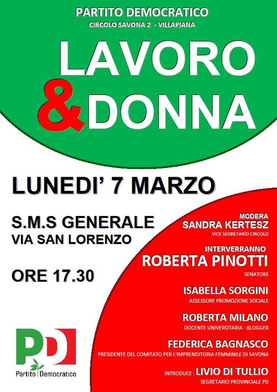 Il Partito Democratico di Savona attraverso il circolo di Savona 2 – Villapiana organizza un incontro di approfondimento sul tema del Lavoro visto dalle Donne. Si analizzeranno attraverso gli interventi programmati le azioni di welfare a supporto delle donne lavoratrici, la creatività femminile al servizio delle nuove professioni e il mondo dell’imprenditoria in rosa. Interverrà all’incontro la Sen. Roberta Pinotti. Introdurrà la serata il segretario provinciale Di Tullio.