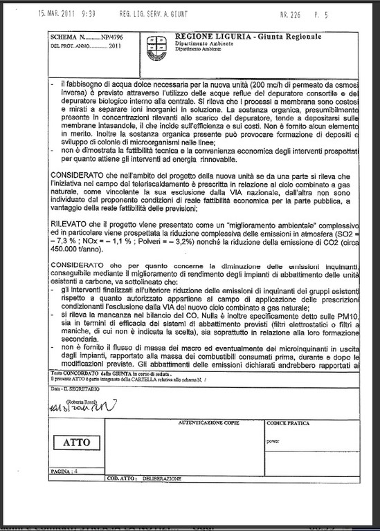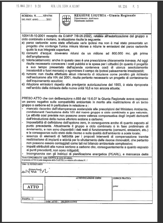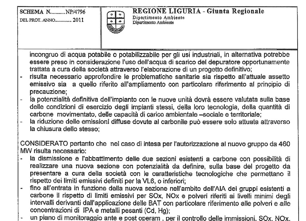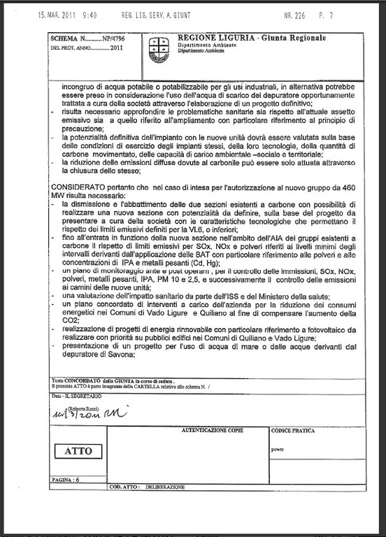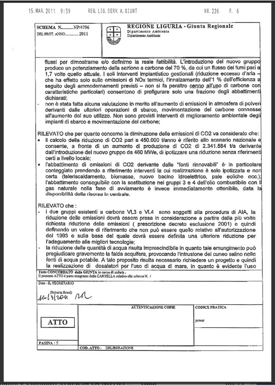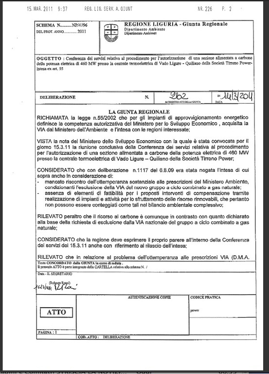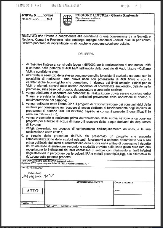 Alleghiamo in copia per i nostri lettori copia integrale della delibera sull'ampliamento a carbone della centrale di Vado