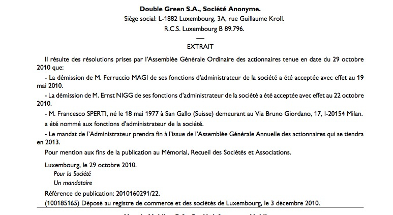 il 3 dicembre 2010 si dimette Ferruccio MAGI, nel frattempo subentrato, ed Ernst NIGG. Nominato amministratore lo svizzero italiano Francesco Sperti