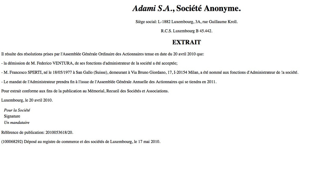 - La ADAMI S.A. è stata costituita nel Granducato d'oltralpe nel lontano 1993 come Ahami Holding, poi sottoposta a liquidazione giudiziaria il 27/09/2002 diviene Adami S.A. (Società Anonima) con a capo un impiegato Lussemburghese, tale Pascale Loewen.