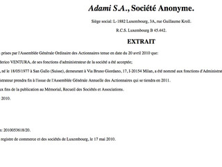 - La ADAMI S.A. è stata costituita nel Granducato d'oltralpe nel lontano 1993 come Ahami Holding, poi sottoposta a liquidazione giudiziaria il 27/09/2002 diviene Adami S.A. (Società Anonima) con a capo un impiegato Lussemburghese, tale Pascale Loewen.
