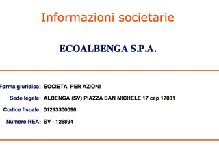 La società ECOALBENGA SPA risulta attualmente composta dallo stesso Comune di Albenga che ne detiene il 52% e dalla ALBENGA GREEN SrL con un 48% ca.