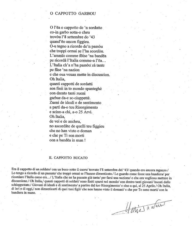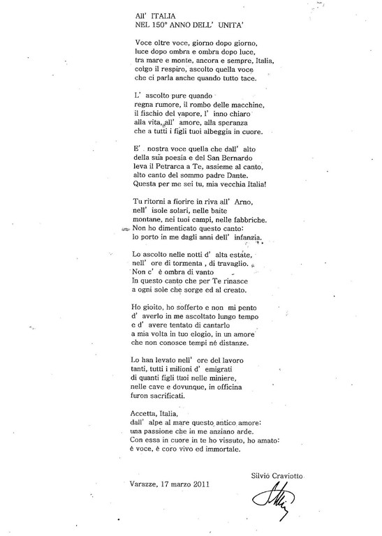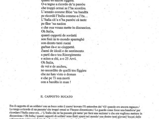 Ed ecco che, presa qualche fotocopia, mi porge il testo di una sua poesia dedicata “All’Italia nel 150° anno dell’Unità” e un testo di Mario Traversi: “O Cappotto Garbou”.