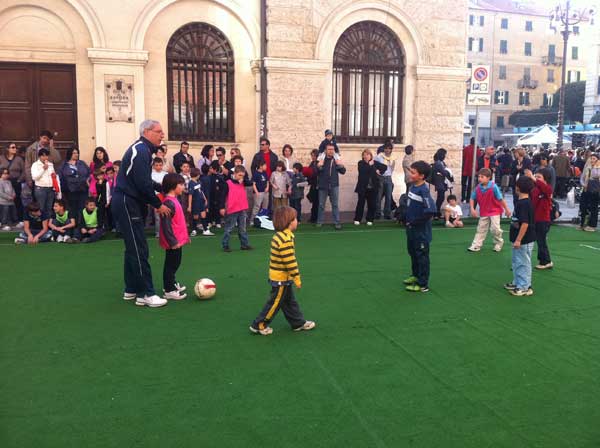 Il Savona Calcio guidato dal Prof.Giancarlo Bossolino Responsabile della Scuola Calcio, nello spazio a disposizione in Via Manzoni, ha intrattenuto con giochi e tornei di calcetto più di 200 bambini della città di Savona. La giornata era bellissima ed assolata. Nel pomeriggio è intervenuto anche Mauro Briano difensore della prima squadra e alle 18,30 Giancarlo Bossolino e Frisceu, la simpatica mascotte del Savona, sono saliti sul palco per rispondere alle domande dello speaker di Radio 19.