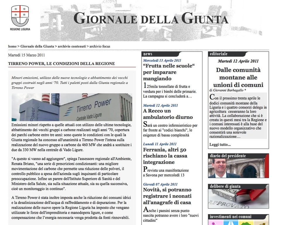 Emissioni minori rispetto a quelle attuali con utilizzo delle ultime tecnologie, abbattimento dei vecchi gruppi a carbone realizzati negli anni '70, copertura dei parchi carbone entro tre anni: sono queste le condizioni con le quali la Giunta regionale ha concesso all'unanimità a Tirreno Power l'intesa sulla realizzazione del nuovo gruppo a carbone da 460 MW che andrà a sostituire i due da 330 MW nella centrale di Vado Ligure.