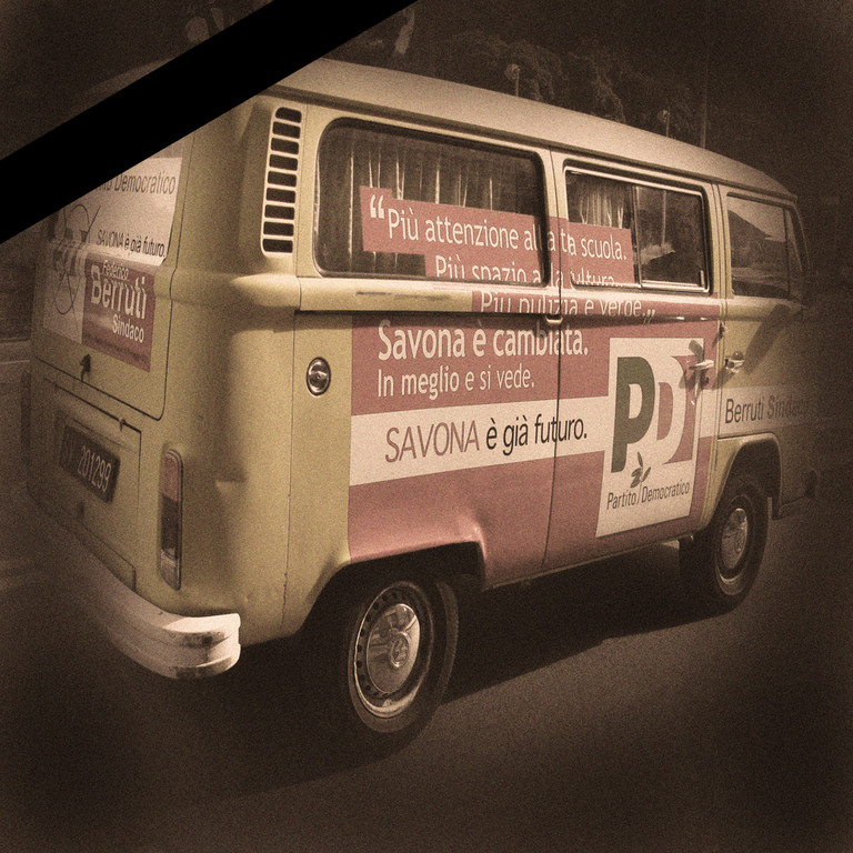 Probabilmente si è scelto e cercato di far leva sul mito e il volkswagen giallo è stato fatto oggetto di un mezzo recupero storico. Una lustrata alla meglio, una fasciata di adesivi ed eccolo sbucare dal parcheggio dell'annerita Torre Orsero per attraversare via Aurelia tutta la Città, fino alla Soms di Legino, nei pressi dello stadio. l'attenzione dell'elettore viandante è assicurata, come un temerario sorpasso in doppia linea continua accanto all'autobus in fermata e proprio in faccia alla panda nr.1 della Polizia Municipale, che senza sirena alcuna fa altrettanto e se ne sta.