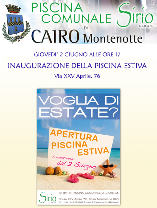 La nuova piscina scoperta comunale, di 20 metri per 12 interrata e realizzata in cemento armato, è situata accanto alla struttura dell'impianto coperto già funzionante, ed è dotata di un'area di svago, con bar, prato, ombrelloni ed è previsto il prolungamento serale dell'apertura.
