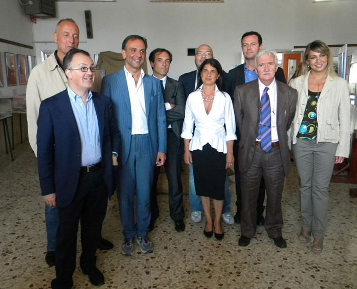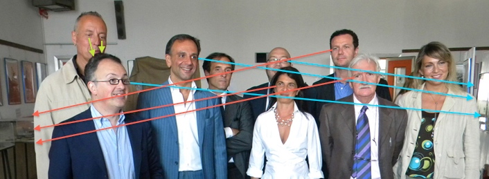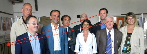 Finalmente un po' di allegria nella fotina di gruppo della "nuova" giunta comunale presentata stamane. Da sinistra a destra si nota un immenso Jorg Costantino - con l'immancabile giubbotto d'ordinanza - osservare con grande interesse la piazzola del povero Martino che non si capice bene che cosa stia osservando a destra - campo con tanta lieta incredulità.