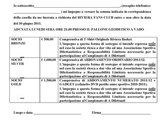 "Ognuno potrà scegliere tra le diverse forme di sostegno. Si invitano tutti i simpatizzanti a dare la maggiore pubblicità possibile alla iniziativa - concludono i supporters - l’ A.S.D. Riviera Vado Basket, nel caso venga raggiunto l’impegno a versare una somma tale da poter affrontare il prossimo campionato entro il 24 giugno 2011, convocherà tutti coloro che hanno comunicato il loro impegno per avviare le procedure del caso e raccogliere i versamenti."
