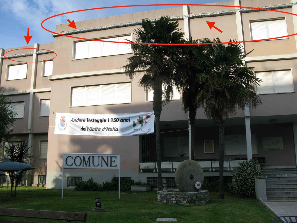 In una delle capitali rivierasche del cemento, questo materiale non sembrano padroneggiarlo del tutto. Perlomeno quelli che han costruito il moderno edificio del Comune i cui cornicioni si stanno sgretolando. Forse per impreziosire le armature di ferro arrugginite che con lo sgretolio mano a mano emergono, qualcuno ha pensato di pittarle con graziose pennellate lilla, che sembrano quasi una decorazione voluta secondo antica tradizione locale.