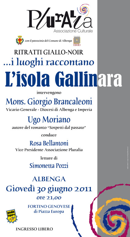 “...i luoghi raccontano l'Isola Gallinara”. È questo il titolo dell'incontro previsto per Giovedì 30 Giugno alle ore 21.00, presso il Fortino cinquecentesco di Piazza Europa ad Albenga, organizzato dall'Associazione Culturale Pluralia, con il patrocinio del Comune di Albenga e della Palazzo Oddo Srl e la partecipazione di Radio Onda Ligure, nell'ambito della rassegna “Ritratti Giallo-Noir”.
