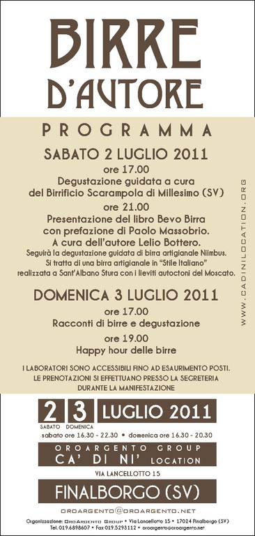 Alle ore 21.00 si terrà la presentazione del libro Bevo Birra a cura dell’autore Lelio Bottero. La pubblicazione è in edicola dal 13 giugno 2011, allegata a “La Stampa”. Bevo Birra è un manuale maneggevole, esaustivo, ricco di immagini e curiosità sul mondo della birra.