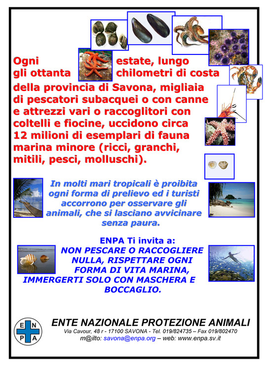 • Un totale di almeno 12 milioni di animali marini, che vivono lungo gli 80 chilometri di costa della provincia di Savona, saranno sterminati durante questa stagione estiva da migliaia di turisti, soprattutto italiani, armati di canne, fucili subacquei, coltelli, arpioni, salai e fiocine. E la strage si aggiunge ad un’attività di pesca professionale parti-colarmente pesante e con scarse limitazioni, condotta con mezzi supertecnologici micidiali che moltiplicano l’efficacia delle reti da pesca, aggravata dalle numerose quote attribuite alla cosiddetta pesca sportiva.