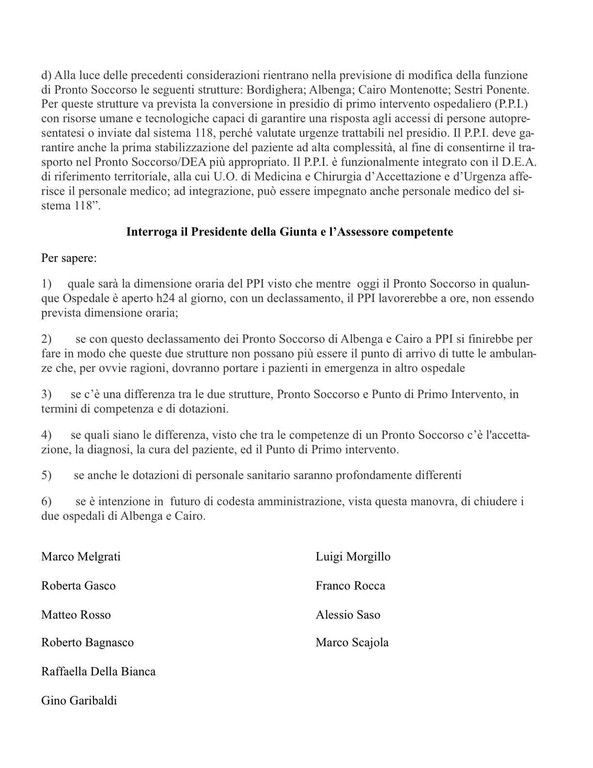 In conclusione Melgrati sottolinea : “ siamo molto allarmati rispetto a questa decisione, i tagli alla sanità stanno facendo venire meno l’offerta sanitaria nel Ponente e nella Val Bormida, quest’ultima in particolare presenta anche notevoli complessità sotto il profilo della morfologia del territorio e dei collegamenti. Per questo vogliamo approfondire la questione: non possiamo accettare una penalizzazione di questo tipo anche perchè a farne le spese sono esclusivamente i cittadini”.