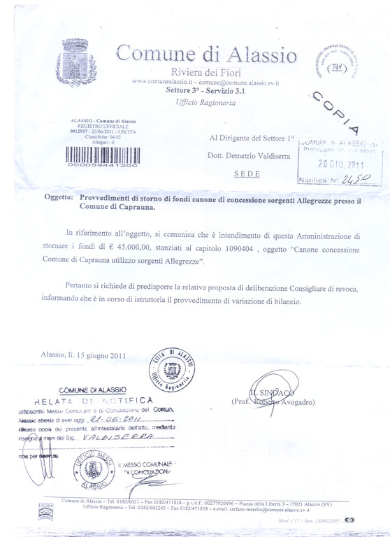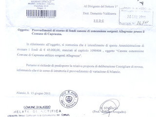 Oggi scopriamo che, con lettera datata 15 giugno 2011, il Sindaco Avogadro chiede al Dirigente del I settore, dott. Demetrio Valdiserra, di predisporre la proposta di deliberazione consiliare relativa alla revoca dello stanziamento di bilancio dei fondi di euro 45.000, stanziati sul capitolo 1090404 all’oggetto “Canone Concessione Comune di Caprauna utilizzo Sorgenti delle Allegrezze”, in quanto è intendimento dell’amministrazione di stornare i fondi.