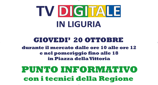 Il 24 ottobre ci sarà il passaggio al digitale terrestre: la Regione, in collaborazione con il Comune, sarà presente con un punto informativo giovedì 20 ottobre in Piazza della Vittoria durante il mercato settimanale dalle ore 10 alle ore 12 e nel pomeriggio sino alle ore 18.