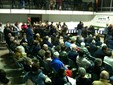 Tutti seduti. Finalmente si inizia. La sala è gremita in ogni ordine di posti, il parterre che conta 160 sedie, quelli in alto nel “loggione”, quelli seduti nei posti del “pubblico” della bocciofila e un buon numero di persone i piedi tutto attorno alla sala. Due le cose che si notano subito: pochi, troppo pochi, i giovani intervenuti e una netta dicotomia tra quelli vestiti bene e i semplici cittadini. L'ing. Canavese unico tra i relatori in tenuta casual, forse sapeva che per lui stasera ci sarebbe stato da “lavorare”.