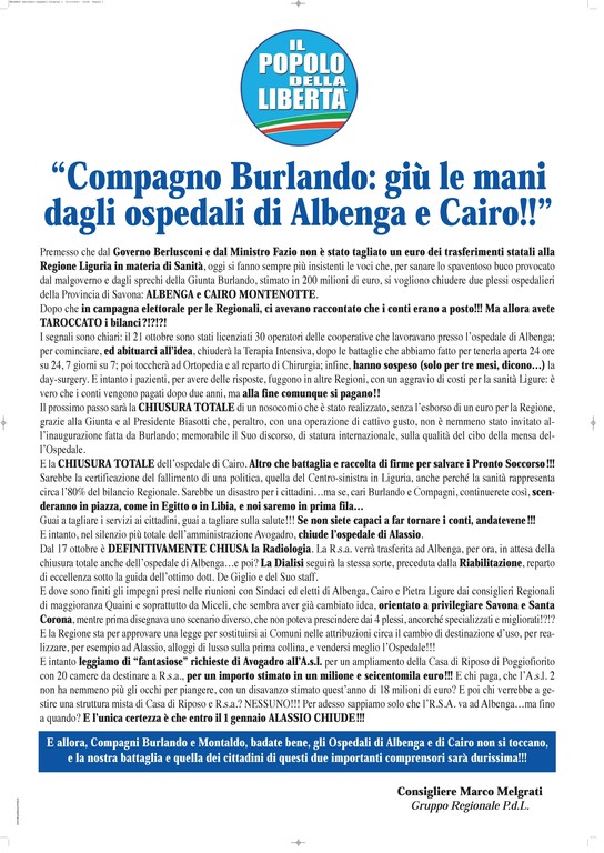 Con la salute non si scherza, e per questo ho deciso una campagna di manifesti per sensibilizzare i cittadini del ponente Savonese e della Valbormida al grido di “Compagno Burlando: giù le mani dagli ospedali di Albenga e Cairo”.