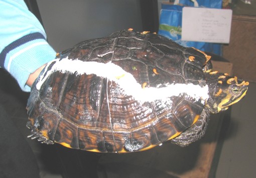 Una grossa tartaruga d’acqua è precipitata ieri da un palazzo di corso Tardy e Benech a Savona sul sottostante marciapiedi; per il lungo volo si è completamente spezzata il pur robusto carapace, ferendola gravemente