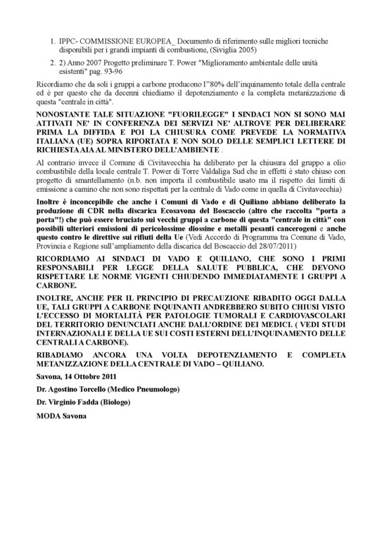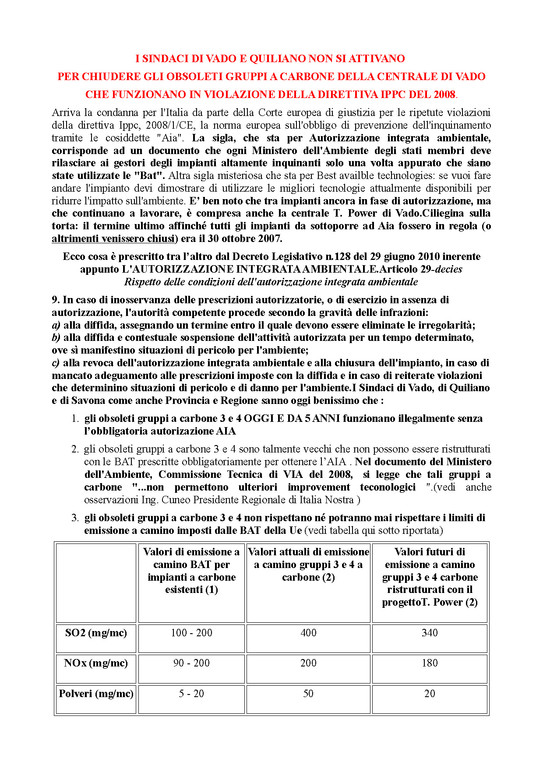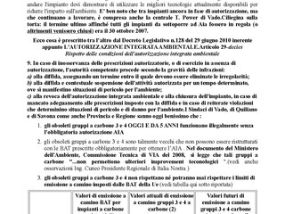 - La nostra continua richiesta a Sindaci, Provincia e Regione di far chiudere gli inquinanti gruppi a carbone, che solo a vantaggio di T. Power funzionano a pieno regime causando l’80% dell’inquinamento dell’intero impianto, è basata sull’obbligo di far rispettare la norma IPPC AIA della Ue e del relativo Dlgs 128/2010 della Legge italiana. Tale legge per gli impianti esistenti a carbone prescrive precisi limiti di emissione (BAT) che non sono rispettati da più di 4 anni dagli obsoleti gruppi a carbone 3 e 4 ormai non più ristrutturabili e infatti la centrale lavora "illegalmente" in assenza della obbligatoria autorizzazione AIA. La normativa citata, in caso di inadempienze, a tutela della salute e dell’ambinte, prescrive da parte dell’Autorità prima una diffida e poi anche la chiusura dell’impianto.